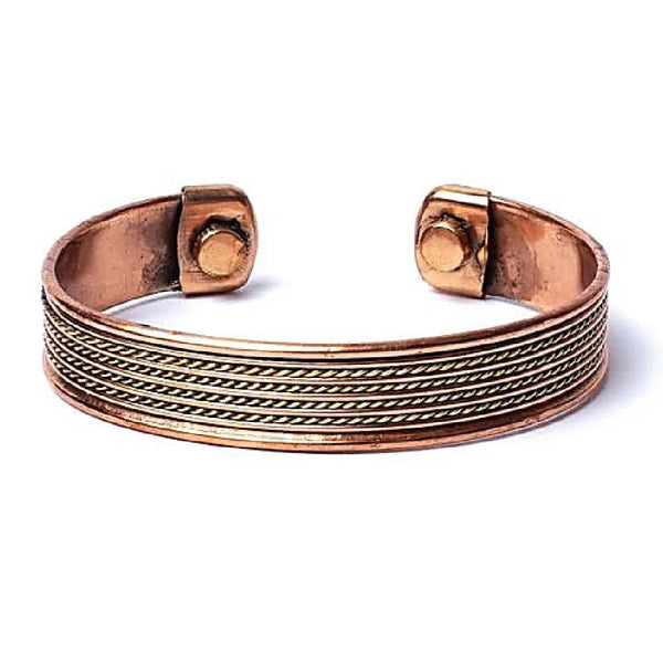This bracelet is made of copper with small magnets attached at both ends.* Since early times, copper and magnets are believed to be helpful in relieving arthritis and rheumatic symptoms.**