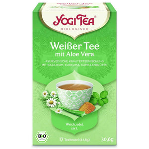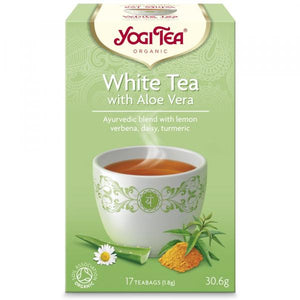 Yogi Tea Organic White Tea with Aloe Vera, tea bags. For this exceptional composition, carefully selected white tea was combined with aloe vera, mildly spicy turmeric and delicate fragrant chamomile flowers. Warming cinnamon gives this tea a fine, slightly sweet taste. Lie back and nurture your soul with the pleasure of a cup of White Tea with Aloe Vera.